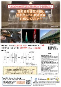 ◆日程:2025年12月23日(火) ◆最少催行人数 15名様 ◆旅行代金(おひとり様)12,000円(大人・小学生同額) ◆行程 🚉池袋駅(9:00発)🚌⇒草加せんべいの庭(煎餅焼き体験)🚌 ⇒首都圏外郭放水路(地下神殿コース見学)🚌⇒ヤマヤ 昼食 ⇒みどりスーパー見学・お買い物🚌⇒池袋駅🚉(16:00頃着) ☆★☆ツアーポイント☆★☆ 👀✅「草加せんべいの庭」でせんべい焼き体験&お買い物🎵 👉✅予約困難💦首都圏外郭放水路 日付限定の『流域治水ライトアップ地下神殿コース』をお楽しみ下さい 👀✅テレビに多数出演で話題の『みどりスーパー』へ立ち寄り❣ 【旅行企画・実施/お申込み・お問合せ】東武トップツアーズ株式会社 池袋駅支店 📞03ー3981ー1231(月~土10:00~18:00)日・祝・年末年始休業 WEB予約は二次元コードをご利用ください♪↓↓↓詳細はチラシをご確認ください↓↓↓ 【1223発】これまでのご愛顧に感謝を込めて!池袋発着日帰りバスツアー募集チラシ