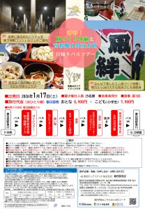 ◆日程:2026年1月17日(土) ◆最少催行人数 25名様 ◆旅行代金(おひとり様)おとな8,900円・こども(小学生)7,900円 ◆行程 🚉春日部駅東口(9:00発)🚌⇒⇒首都圏外郭放水路(地下神殿コース見学)🚌 ⇒みどりスーパー(見学・お買い物)🚌⇒天下一うどん味亭(昼食) ⇒大凧交流センター『ハルカイト』(見学・体験)⇒徒歩⇒江戸川河川敷(凧あげ体験・晴天時) ⇒🚌春日部駅東口(16:20頃着) ☆★☆ツアーポイント☆★☆ ✅世界に誇る防災システムを地下神殿コンシェルジュがご案内 ✅テレビに多数出演で話題の『みどりスーパー』へ立ち寄り❣ ✅昼食は人気の鴨汁せいろ☺ うどんでほっこり♪ ✅みんなで楽しむミニ凧づくり体験!晴れたら2mの大きな凧あげにも挑戦★ 【旅行企画・実施/お申込み・お問合せ】東武トップツアーズ株式会社 春日部支店 📞048ー761ー8741(月~土10:00~18:00)日・祝・年末年始休業 WEB予約は二次元コードご利用いただけます♪↓↓詳細はチラシをご確認ください↓↓↓ 2026.01.17日帰りバスツアーパンフレット①